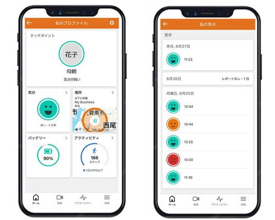離れて暮らす、大切な人の気分・位置・活動レベル・スマートフォンの電池残量が把握できる見守りアプリ ios、androidどちらのデバイスにも対応しております。