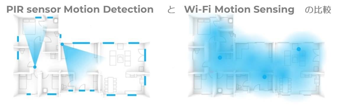 従来の人感センサーとの違い人感センサーに比べ広範囲に動作検知が可能です。(フロア全体/家全体)