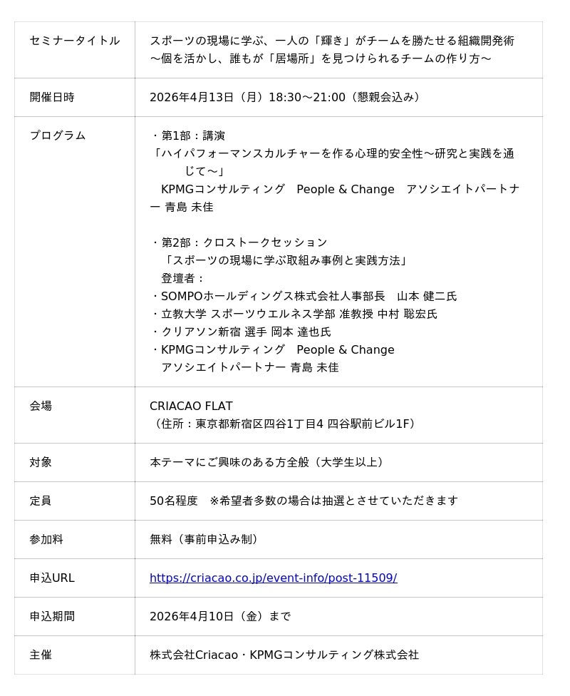 本プロジェクトの第1弾として、クリアソン新宿とともに、日本社会における重要課題であるダイバーシティー・エクイティ&インクルージョン(DE&I)をテーマとした活動に取り組みます。まずは、2026年4月に、KPMGコンサルティングのプロフェッショナルやクリアソン新宿の関係者が登壇する「DE&I企業セミナー」を開催します。ダイバーシティ実現に向けた論理的アプローチや、「個を活かすチームビルディング」を融合させた実践型セミナーを通じて、具体的な組織課題の解決策へと昇華させる機会を提供し、社会課題への理解と行動の広がりを後押しします。