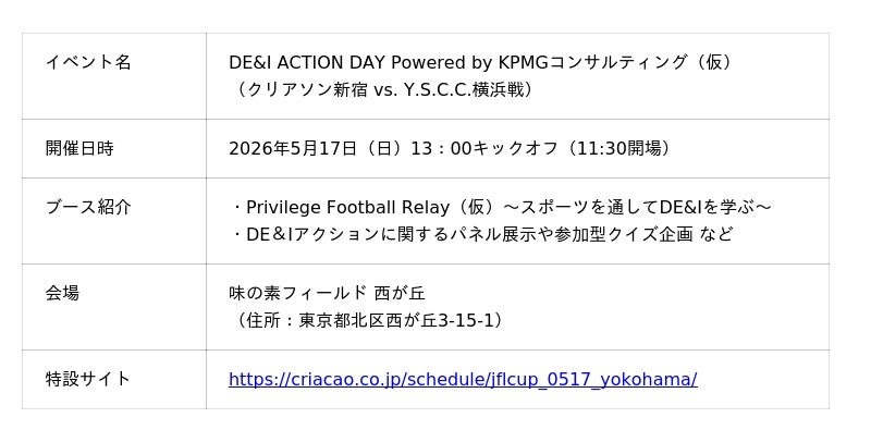 また、2026年5月17日(日)に開催されるクリアソン新宿 vs. Y.S.C.C.横浜戦を「DE&I ACTION DAY Powered by KPMGコンサルティング」と題し、スポーツという開かれた場を通じて、体験型イベントを企画し、多様性や包摂性に関するメッセージを発信します。