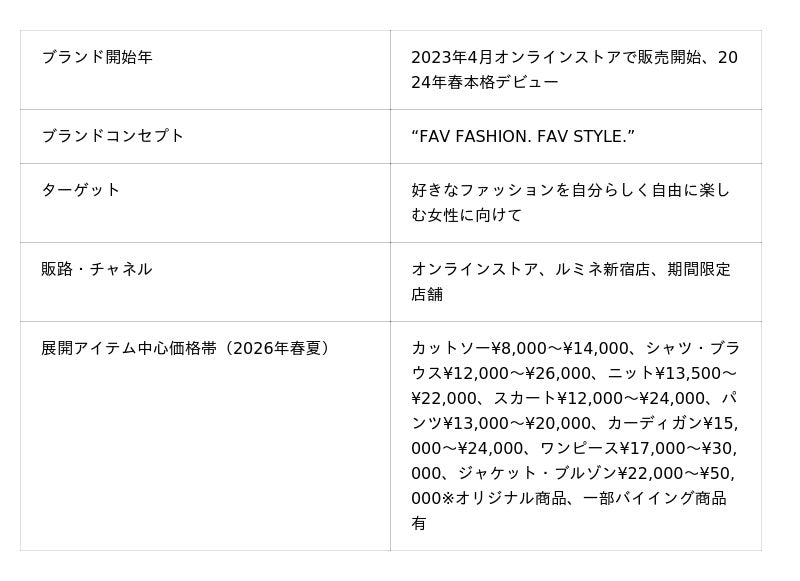 “FAV FASHION. FAV STYLE”をコンセプトに、好きなファッションを自分らしく自由に楽しむすべての女性たちへ向けて、枠にとらわれないスタイルを提案します。