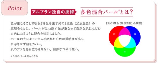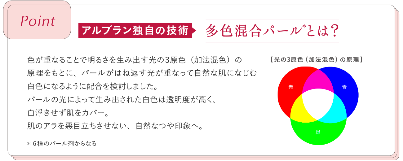 選び抜かれた複数のパールを混合し、パールがはね返す光が重なったときに、肌になじむ白色になるよう配合を検討した、アルブラン独自の技術です。複数の光が重なるほど明るく見える性質(加法混色)に着目し、シミ・くすみなどの色悩みをカバーしながら、白浮きしにくい透明感と自然なつや印象を目指しました。