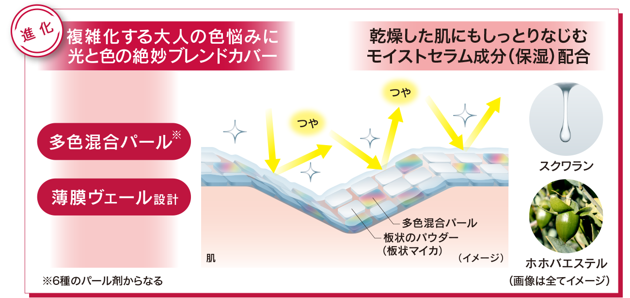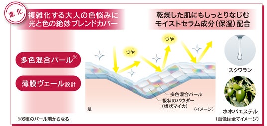 本品は、"隠したいのは、隠した感。"という大人の本音に着目。アルブラン独自の多色混合パール※2と、板状パウダーが薄くなめらかに伸び広がる薄膜ヴェール設計により、厚塗り感のないカバーと仕上がりを両立しました。さらに、モイストセラム成分(保湿)※3を配合し、パウダー剤型でありながらしっとりなじむ使用感を追求しました。