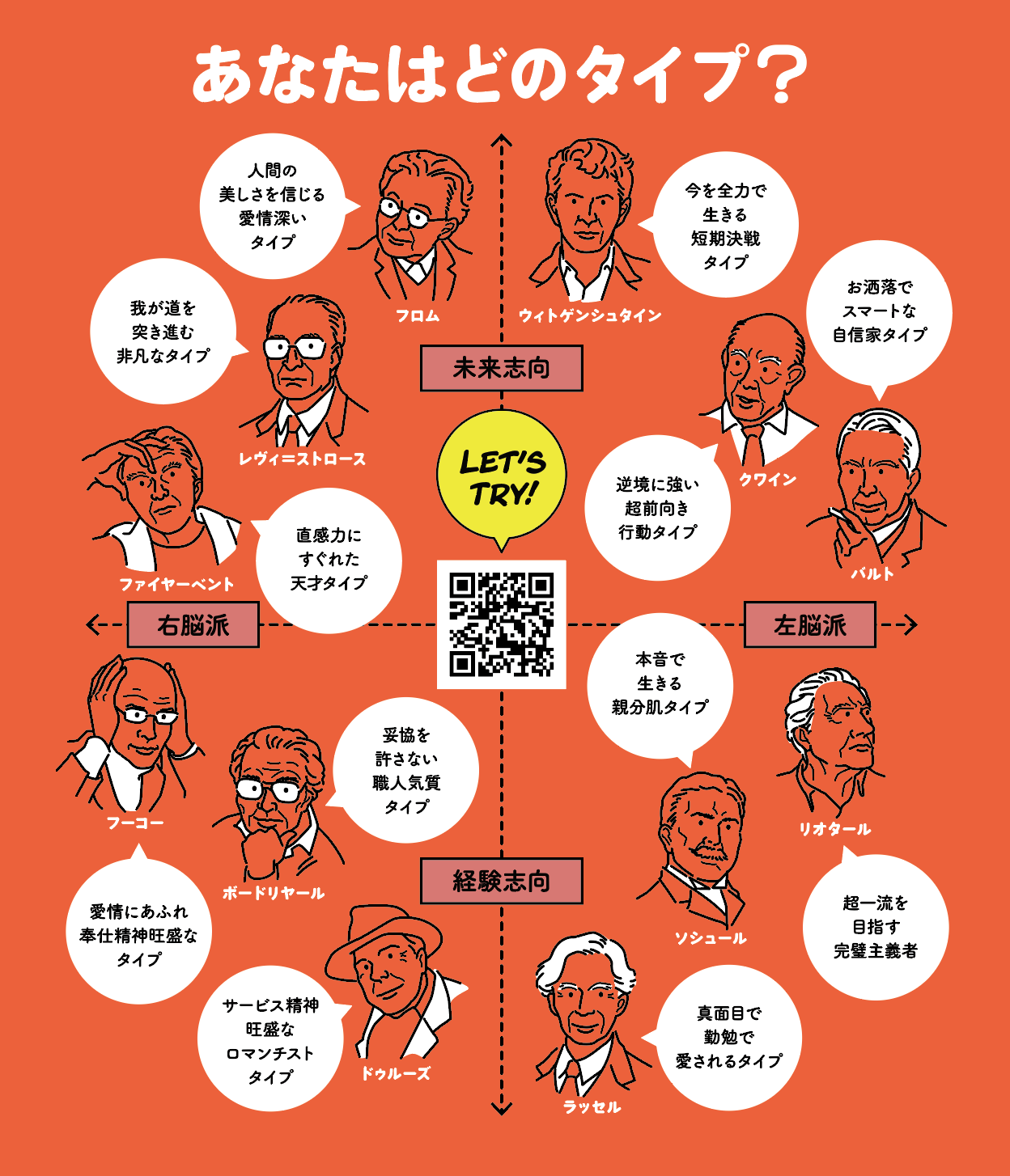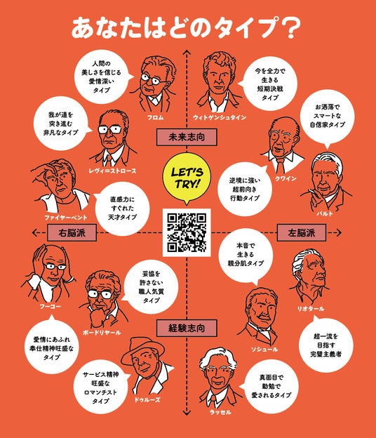 『哲学者占い』は、陰陽五行や四柱推命といった数千年の歴史を持つ統計学をベースに、人間の不変的な思考特性を12人の現代哲学者になぞらえて可視化します。
