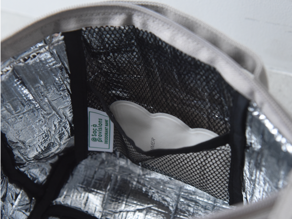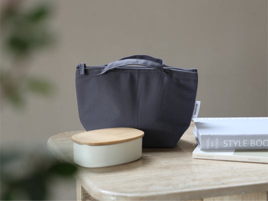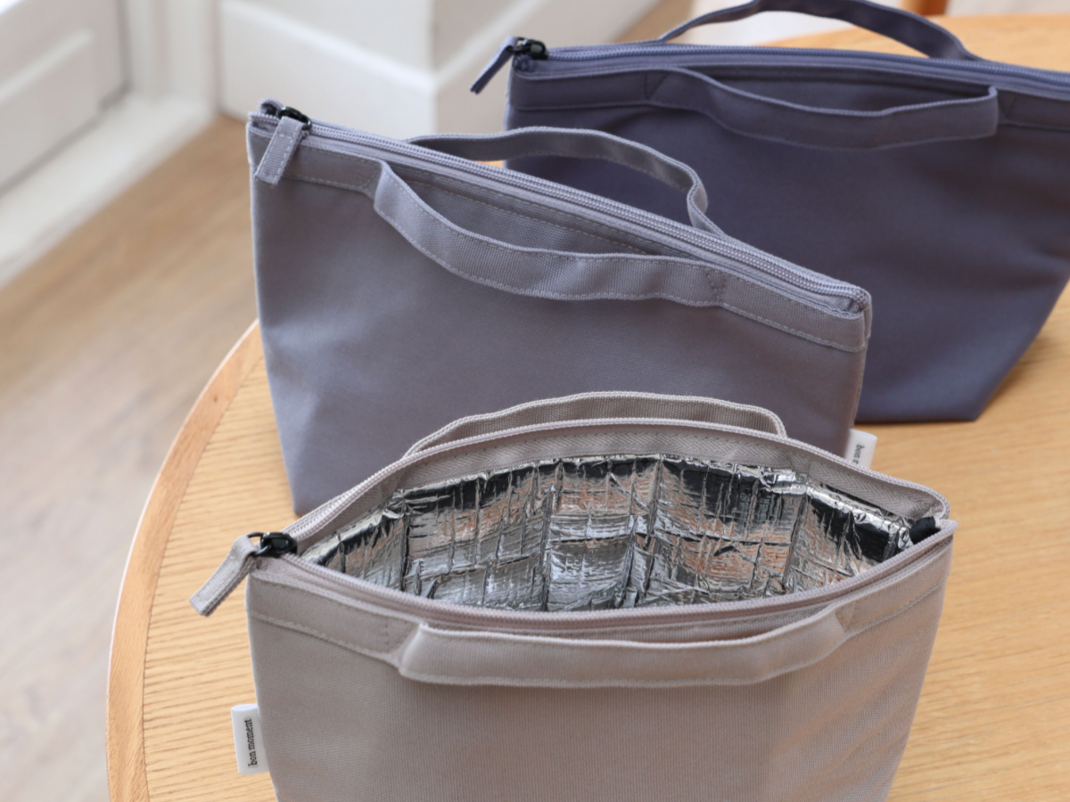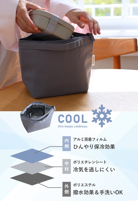 ランチバッグの内側は保冷力のある「アルミ蒸着フィルム」、中層には冷気を逃しにくい「ポリエチレンシート」を採用。バッグのなかに保冷剤を入れることで、冷たい空気が留まる仕組みです。