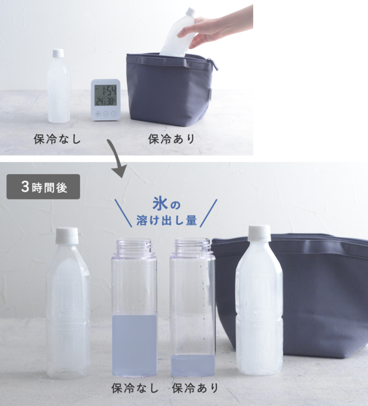 開発に向けて自社にて検証を行った結果、一般的なランチバッグ・ペットボトルケースと比べても高い保冷力を証明。凍らせたペットボトルを「強保冷シリーズに入れた状態」「保冷なしの状態」で比べたところ、3時間後の氷の溶け出しに3倍もの差がつきました。