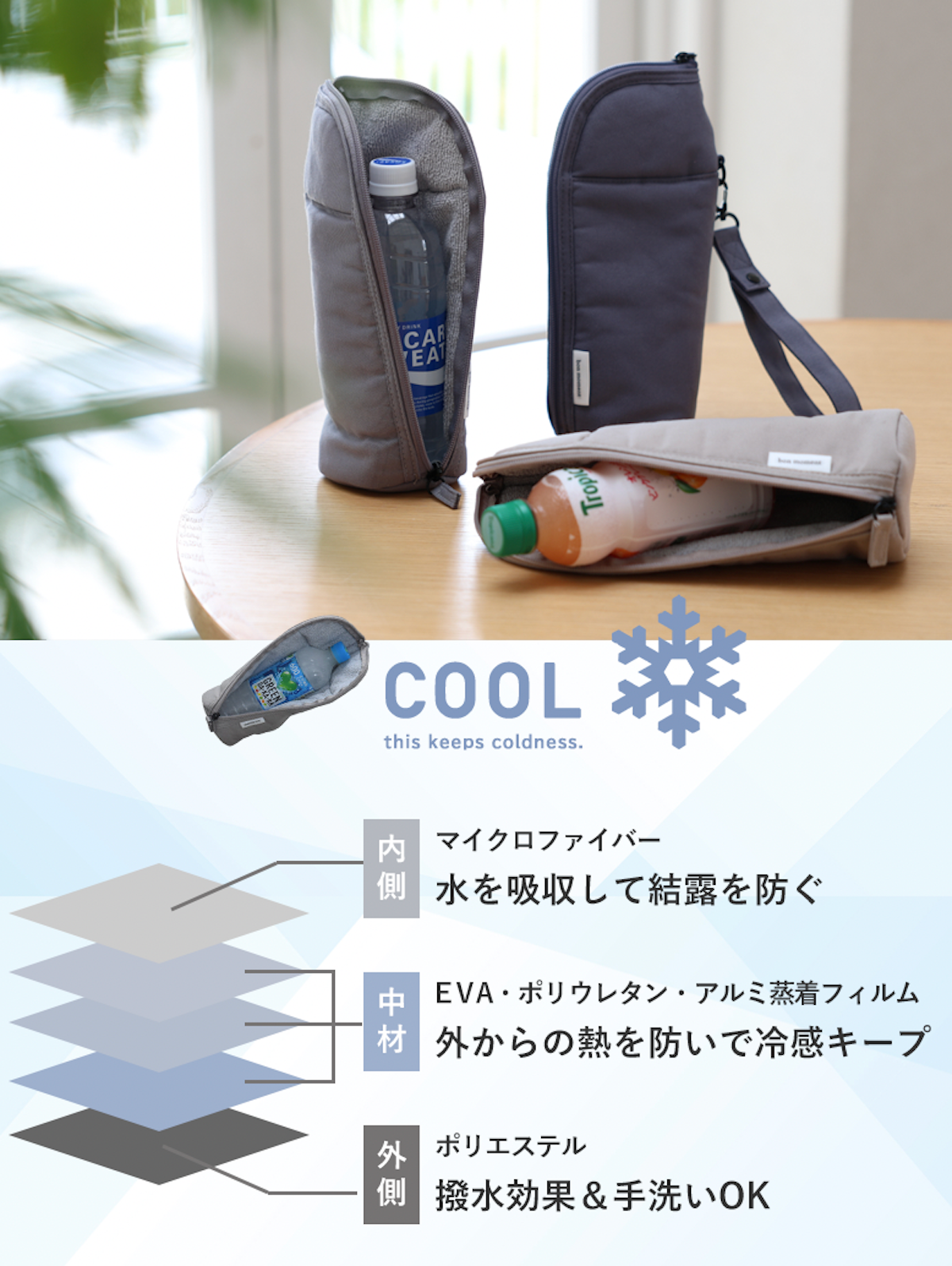 ペットボトルケースの内側は結露を吸い取る「マイクロファイバー」を使用。さらに中層にEVA・ポリウレタン・アルミ蒸着フィルムを重ね、多層構造でしっかりと保冷します。