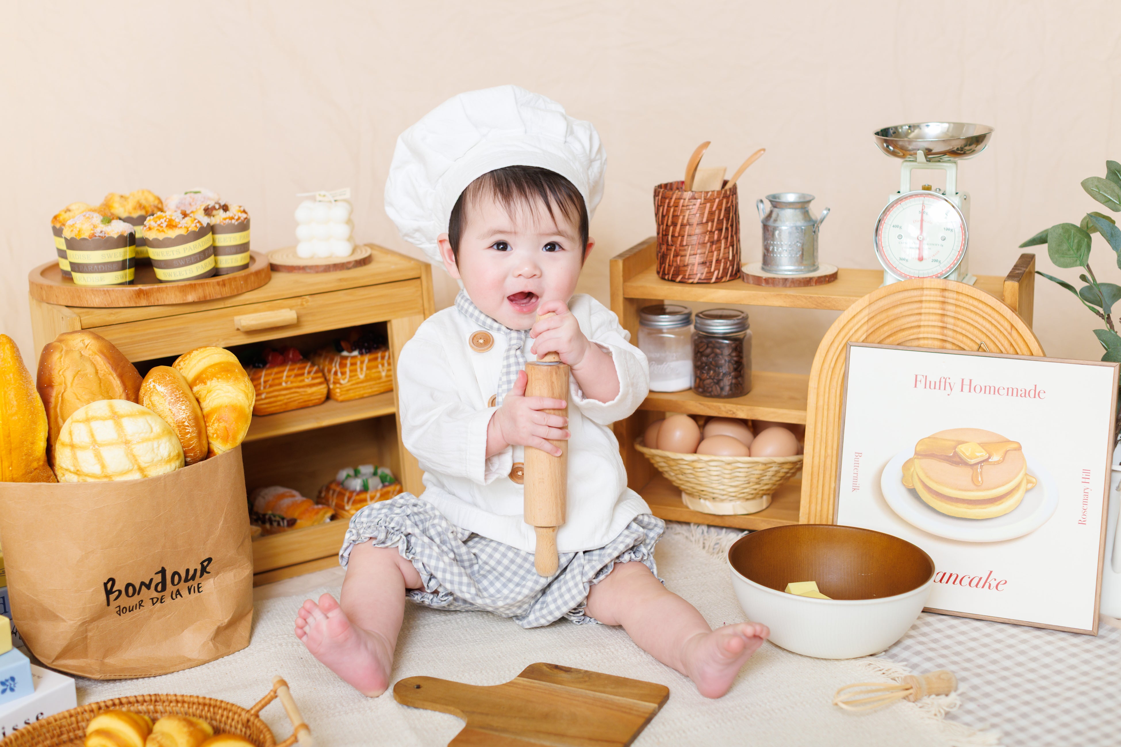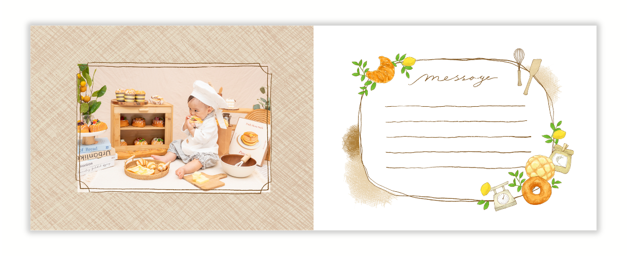また絵本風アルバムプランは、photobaseの大人気企画「ちいさなパン屋さん撮影会」でも販売いたします。韓国風インテリアとナチュラルな色味のセットで、リリース時から多くの方にご参加いただいています。小さなお子さまがパン屋さんになりきる姿を、絵本風アルバムと共に残せる撮影会です。