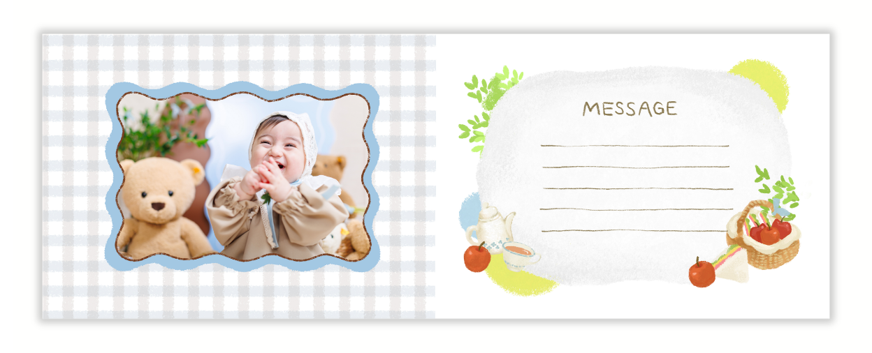 ページの最後にはご家族からのメッセージが書き込める仕様になっています。おじいちゃま・おばあちゃまへのプレゼントや、大きくなったお子さまへ贈り物としても最適です。