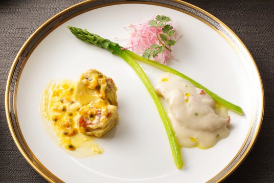 房総金目鯛二種の味わい ホワイトチリソースとパッションフルーツマヨネーズ(大観苑)