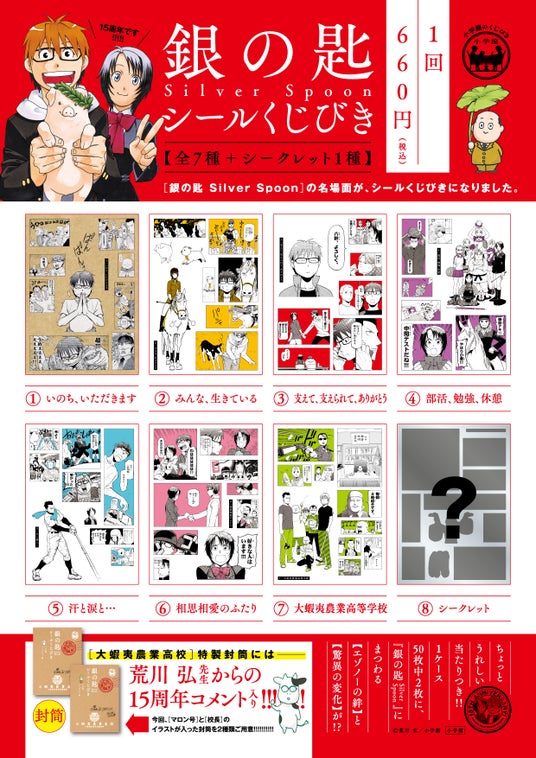 第1巻スペシャル版だけでなく、新商品『銀の匙 Silver Spoon シールくじびき』も同日発売!全国の一部書店・ネット書店で販売いたします。シールくじびきとは、本作の原作絵を使用したシールがくじびき形式で販売されるもの。シールはA4サイズで、デザインはシークレット1種を含む全8種類。「いのち、いただきます」「みんな、生きている」など、コミックスからテーマごとに厳選された名シーンが収録されています。荒川先生のサインがあしらわれた専用の封筒にランダムで入っており、店頭で束からお好きな1枚を引き抜いていただく形式での販売となります。