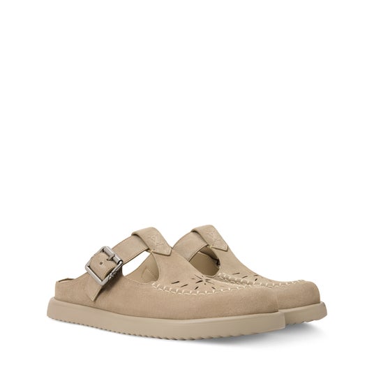 メリージェーンのTバーと調節可能なバックルストラップを備え、スエードカーフレザーで再解釈された今シーズンの「LV イージー ミュール」。アッパーには、クラフツマンシップを感じさせるパーフォレーションとオーバーステッチが施されています。シグネチャーディテールとして、TバーにはLV イニシャル、シルバーカラーのバックルにはモノグラム・フラワーをプラス。軽量なラバーアウトソールがデザインを完成させます。