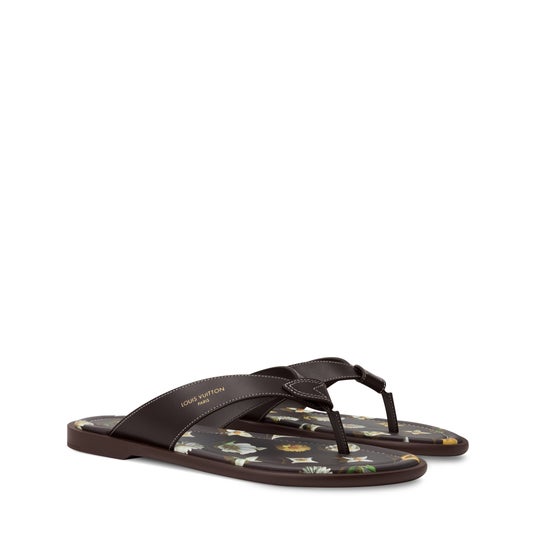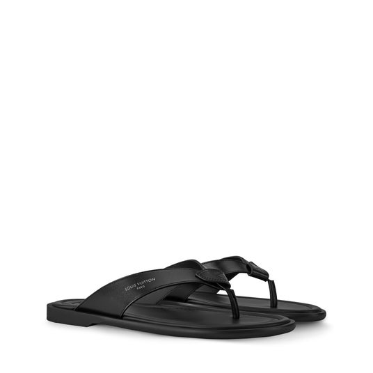 夏の定番スタイルを洗練された雰囲気に解釈し、スムースレザーで仕上げた「LV サンセット トング」。アッパーの「V」シェイプストラップには、ホットスタンプ(焼印)された「Louis Vuitton」シグネチャーと、メゾンのレザーグッズならではのハンドルマウントを折り畳んだようなディテールがあしらわれています。パッド入りインソールとしなやかなラバーアウトソールが、デザインを完成させます。