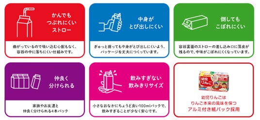 果汁・野菜汁100%等の素材選びにこだわったお子さまのための飲みきりサイズ飲料ブランドです。中身が飛び出しにくい強度や倒してもこぼれにくいストロー穴、怪我をしにくいストロー断面形状など、パッケージを工夫し、お子さまが一人で使用しても安心して見守ることができます。
