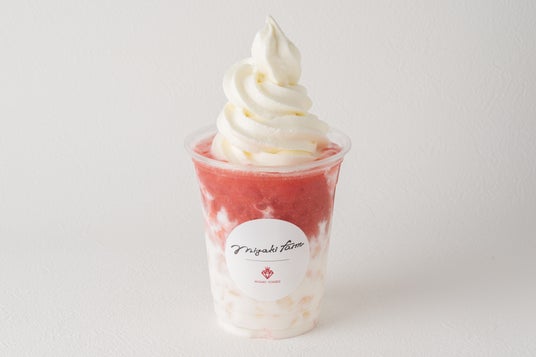 「まるごとけずりいちご」に、濃厚なソフトクリームをプラス。冷たい果肉とまろやかなミルクが口の中で溶け合う、贅沢なハーモニーを楽しめます。