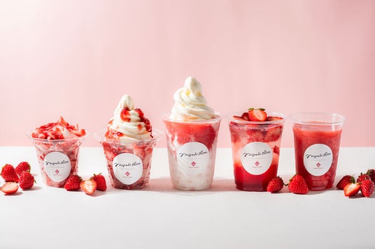 (左から)まるごとけずりいちご、まるごとけずりいちごソフト、ミガキイチゴミルクフロート、ミガキイチゴソーダ、ミガキイチゴスムージー