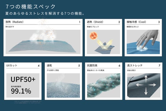 生地性能はライフスタイルラインと同じく、接触冷感・UVカット・速乾・抗菌防臭、そして特許取得の放熱×遮熱テクノロジーを共通採用。