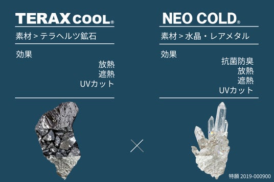 NEO COLD(R)は主成分に水晶を用い、プリントが透明で生地になじみやすく、放熱・遮熱・抗菌防臭などの機能を持つ素材です。