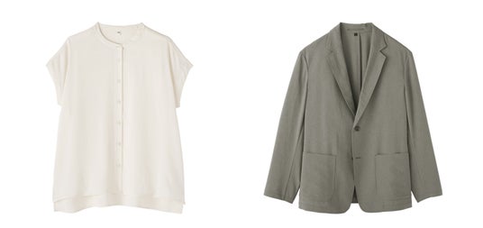 婦人は、落ち感のあるクリーンな素材感のブラウスやパンツを販売します。紳士のジャ ケットは、セットアップでの着用も可能で、自然なシワ感があることで肌に張り付きにく く、さらさらとした柔らかい質感です。 軽量で涼しく、すっきりとしたデザインなので夏場でもきちんと感が出て、快適な着 心地です。オフィスから日常生活まで快適に幅広く着用いただけます。