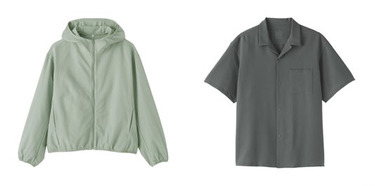 今回発売する「風を通す」シリーズは、糸の形状や織り方を工夫することで生地に風の通り道をつくりました。通気性に優れている ので、蒸し暑い夏を快適に過ごせるシリーズです。シャツとワンピースは、商品にかかわる全ての部材にポリエステル 100%※2を使用し、再資源化しやすい仕様にしています。
