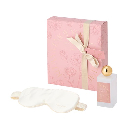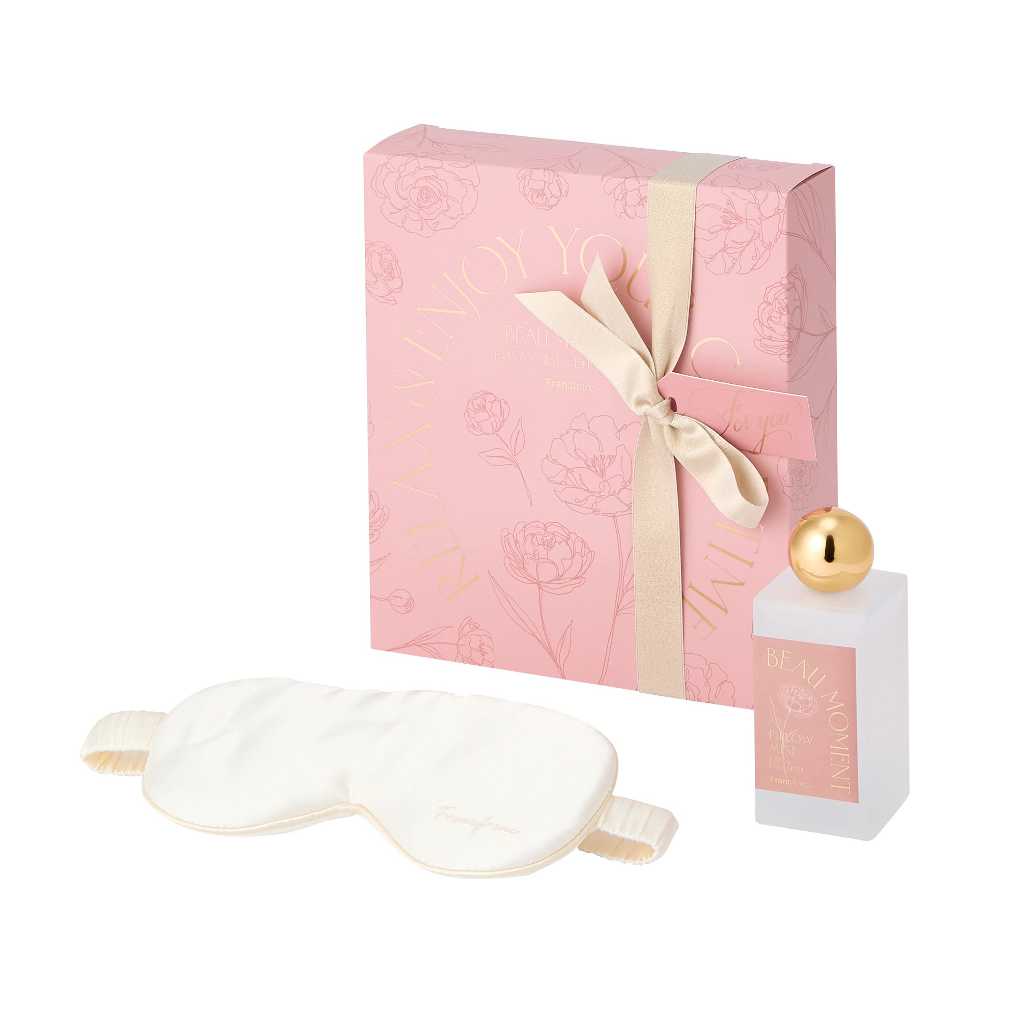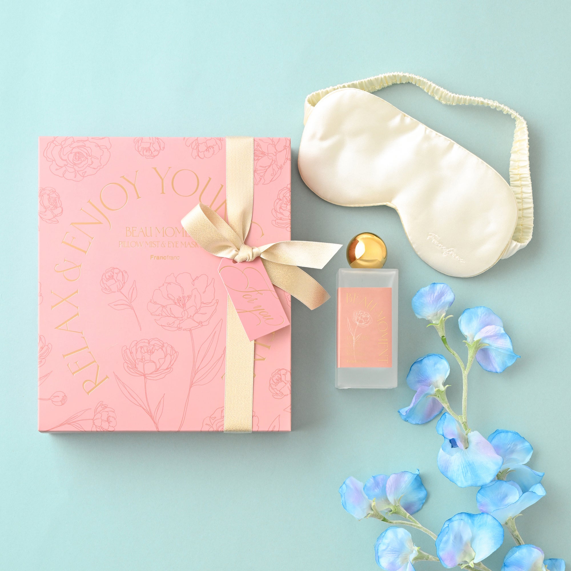 ピローミストとアイマスクのセットです。アイマスクはシルク100%で、繊細な目元をやさしく包み込み心地よい眠りへと導きます。ピローミストは、天然精油を配合した、ローズ&ラベンダーの上品で安らぎのある香り。枕や寝具にひと吹きするだけで、穏やかなリラックスタイムを演出します。ちょっとした休憩時間や就寝前のひとときにおすすめ。パッケージは上品なフラワーデザインに「FOR YOU」のメッセージ入りタグ付きで、そのままギフトとして贈れます。