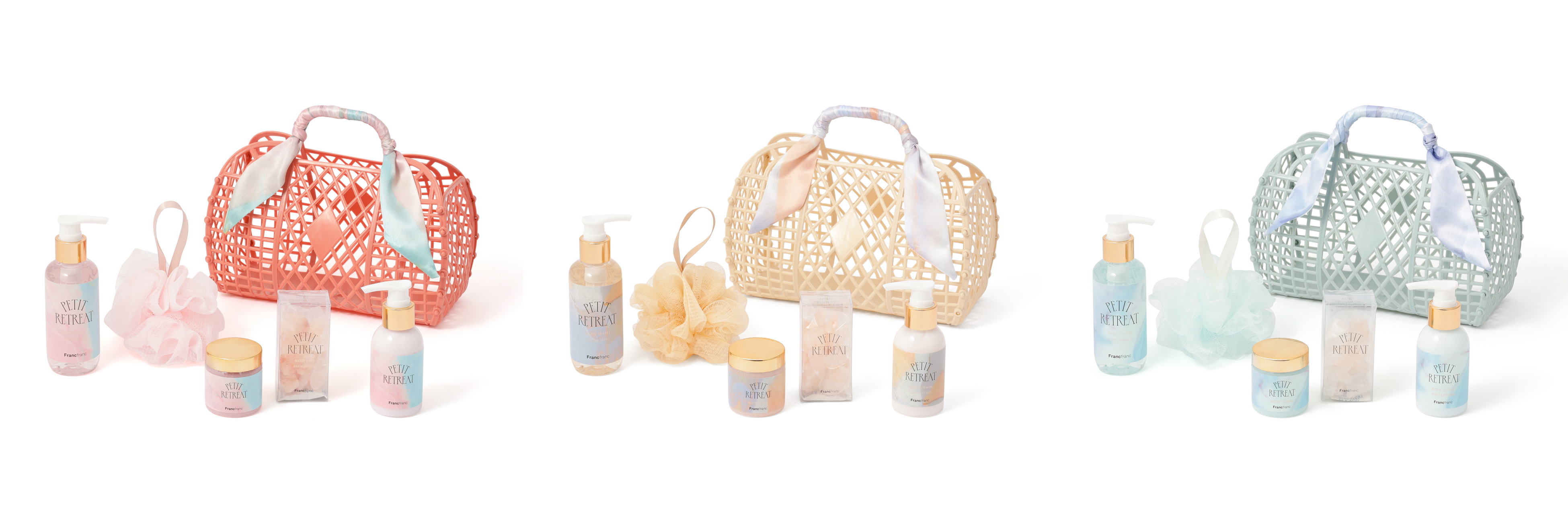 スカーフをあしらったカゴバッグに、ボディケアアイテムを詰め込んだ季節限定のセットです。ボディウォッシュ、ボディローション、ボディスクラブ、バスソルトが入っていて、まるでリゾートで過ごしているかのような、特別なバスタイムを演出します。自分へのご褒美にも、大切な人への贈り物にもおすすめです。ピンクは優しいフレッシュサボンの香り。ベージュは爽やかなクリアシトラスの香り。ブルーは軽やかなホワイトハーバルの香りがふんわりと広がり、心も身体もすっきりとリフレッシュします。パッケージは二次利用可能なカゴを採用しており、洗面道具の収納やプール・スパへの持ち運びにも便利です。