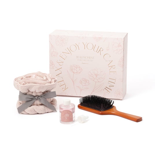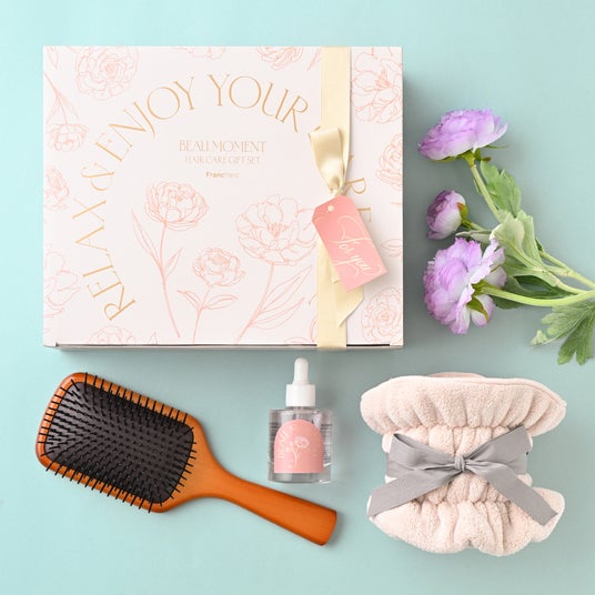 ヘアドライタオル、ヘアブラシ、ヘア&ボディオイルの3点セットです。タオルは、お風呂上りの髪をふんわりと包み込み、髪への摩擦を少なく過ごすことができるヘアタオルです。2層のヘア&ボディオイルはローズ&ラベンダーの上品で安らぎのある香り。香りを楽しみながら、毎日のヘア&ボディケアができます。パッケージは上品なフラワーデザインに「FOR YOU」のメッセージ入りタグ付きで、そのままギフトとして贈れます。
