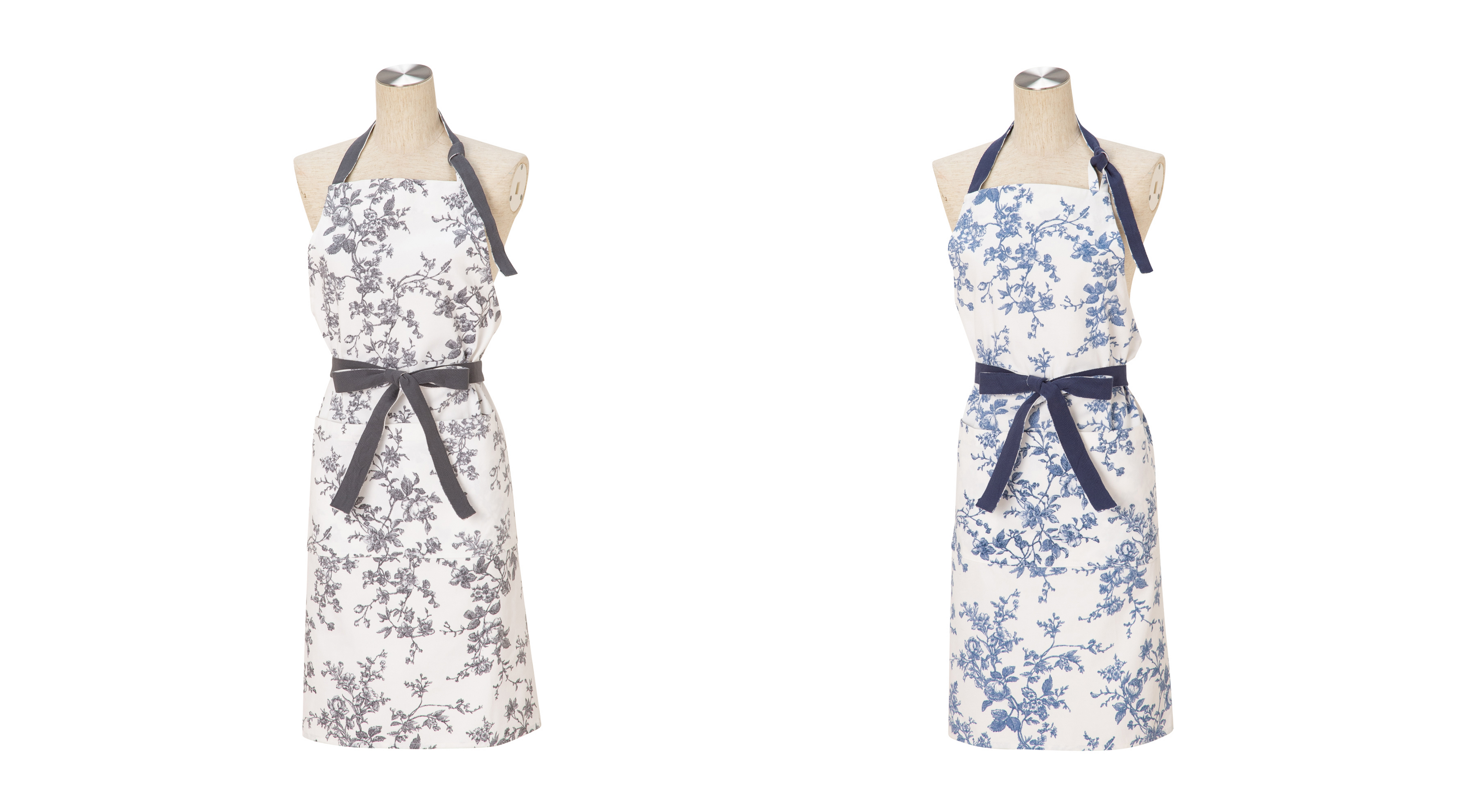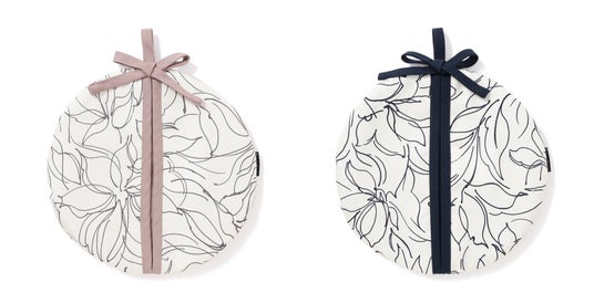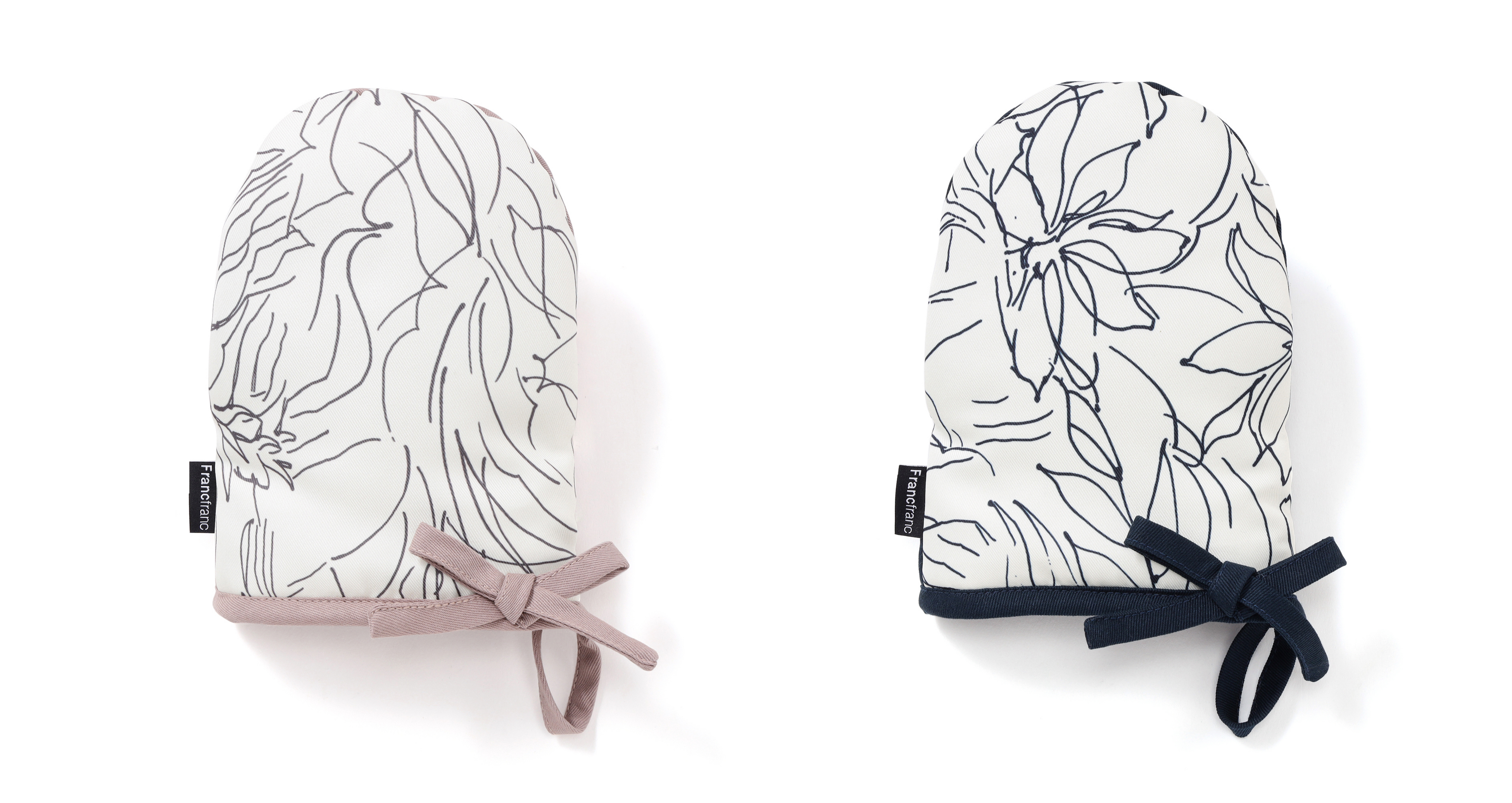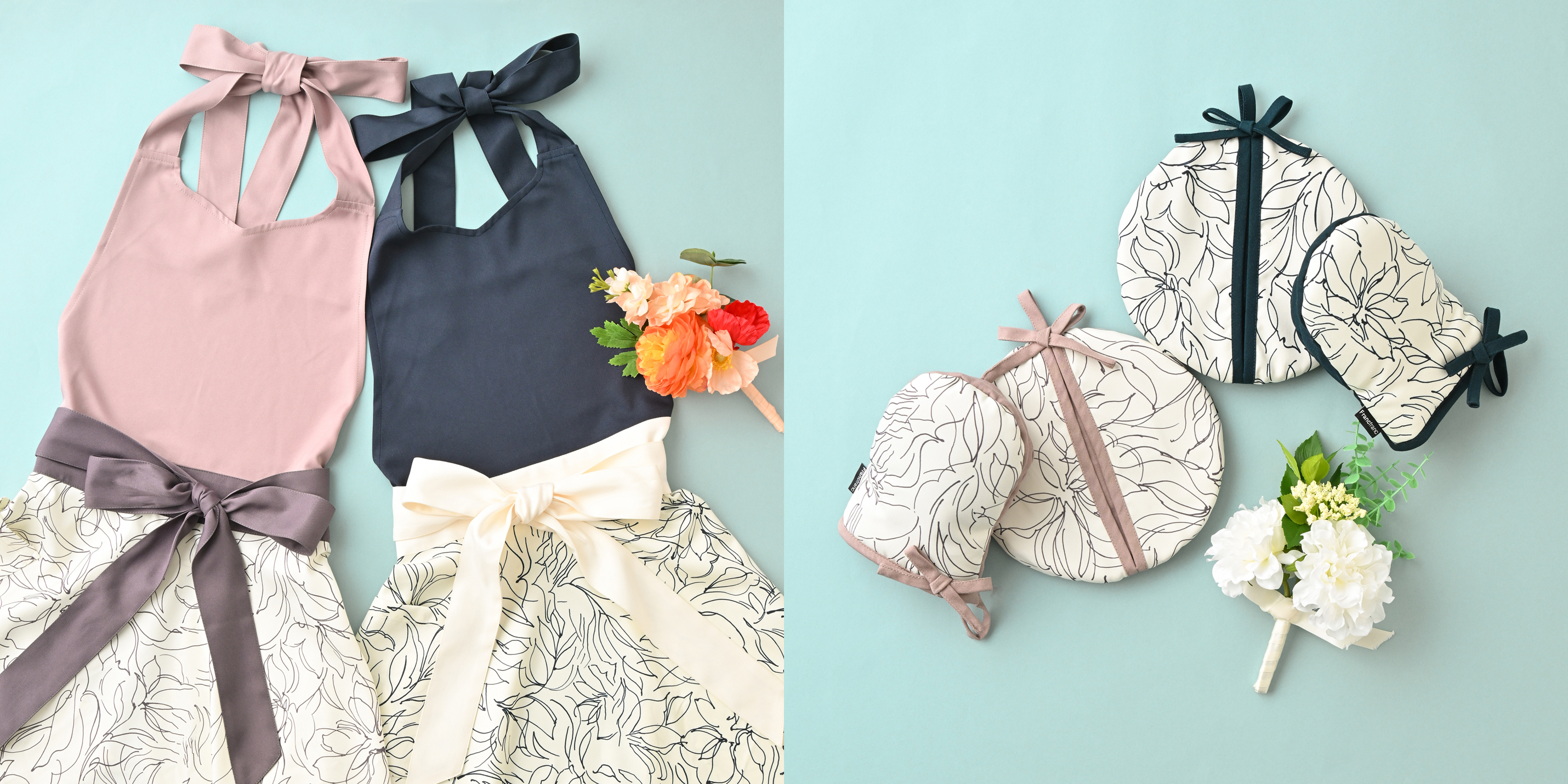 花柄を取り入れたエプロン、ミトン、ポットホルダーです。モノクロの線画調で甘すぎないようにしつつ、トレンド感のあるデザインに仕上げました。毎日の料理時間をお洒落に楽しめるアイテムで、3点のデザインを揃えているので、セットで贈るギフトとしてもおすすめです。ポリエステル素材のため洗濯後も乾きやすく、エプロンはシワになりにくいため日常使いにも最適です。