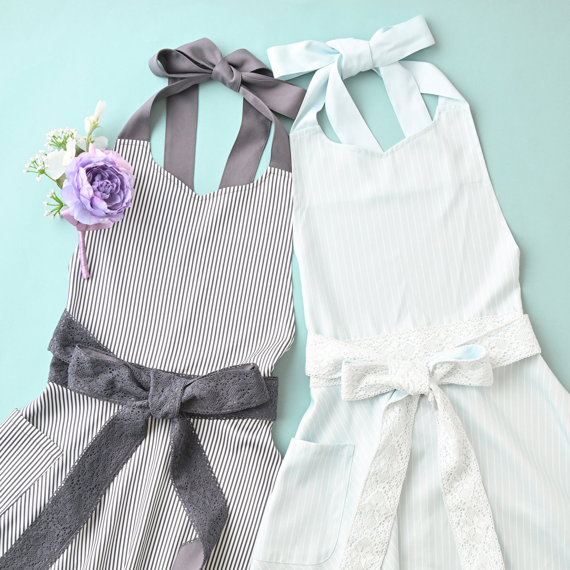 ストライプとレースデザインが特徴のエプロンです。ストライプでブラウスのようなカジュアル感を出しつつ、腰ひものレースで甘さをプラスしています。幅広い世代の方にも着ていただけるように仕上げました。2カラー展開で、自分用にもギフト用にも、好きなテイストをお選びいただけます。ポリエステル素材でシワになりにくく、乾きやすいので日常使いにも最適です。