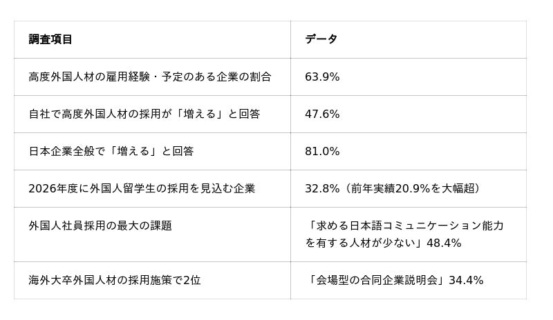 - キャリタス調査(2025年12月)によると、日本企業全般で81.0%が高度外国人材の採用が「増える」と回答。一方で企業の最大の課題は「日本語コミュニケーション力の見極め」であり、対面型採用イベントの重要性が高まっている。