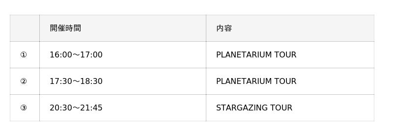 ※プラネタリウムツアー、スターゲイジングツアーの時間帯はプラネタリウム内にはご入場できません。