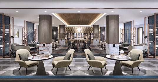 客室やパブリックスペースには、織物の美しい質感を思わせる上質な素材が重なり合うデザインを