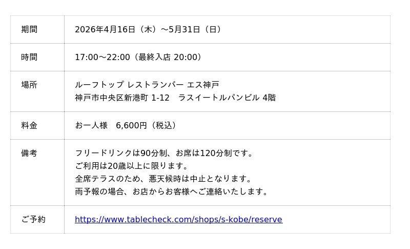 今年3月に開業1周年を迎えたラスイートルパンビルの最上階、「ルーフトップ レストランバー エス神戸」(料理長:笠原 鉄平、所在地:神戸市中央区)は、4月16日(木)に2026年の営業をスタートします。