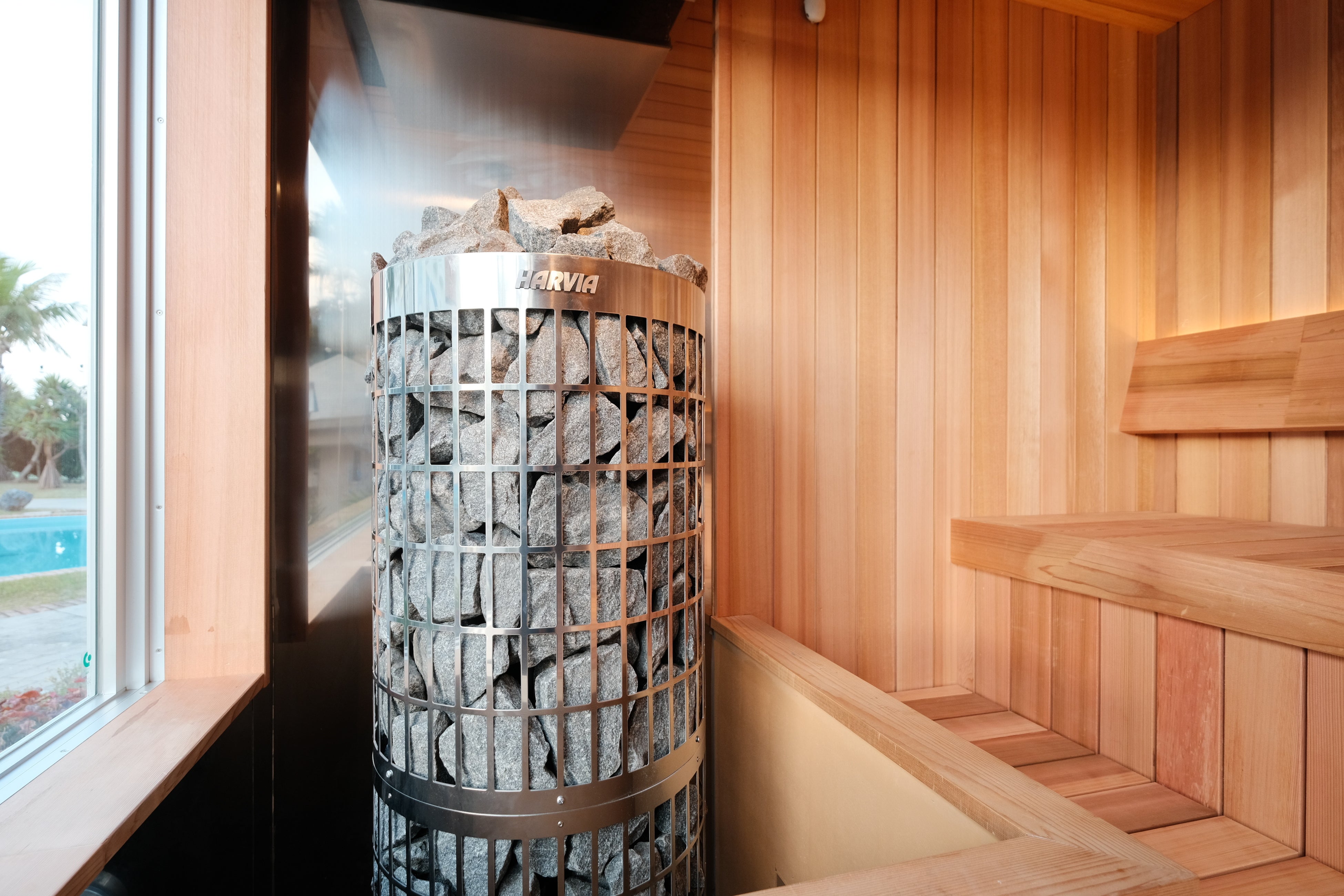 ガラス張りのサウナ室から望むリゾートプールビュー