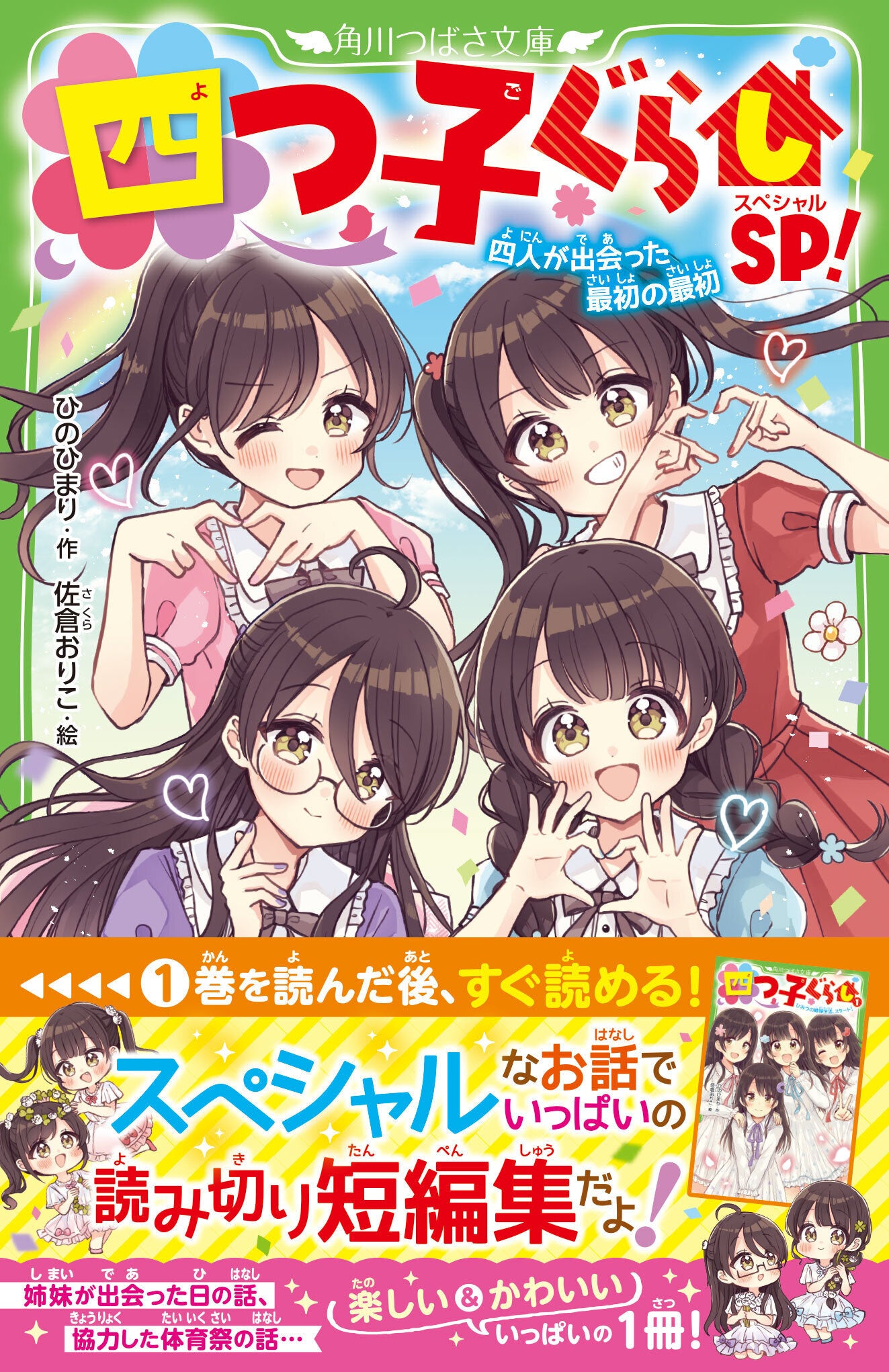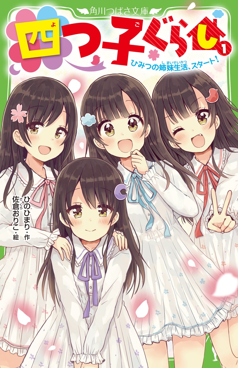 角川つばさ文庫より刊行中の小説「四つ子ぐらし」シリーズは、現在本編が23冊、カラーページを多数収録した『ファンブック』、最新巻まで読んでいなくても楽しめる短編集『四つ子ぐらしSP!』1冊を刊行中の、大人気児童小説シリーズ。角川コミックス・エースより、小説の挿絵を担当している佐倉おりこの作画によるコミックス版『四つ子ぐらし』1~5巻も発売中(以下続刊)です。