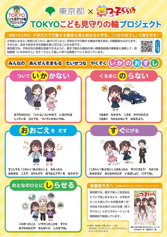 東京都全域の新小学1年生を対象に学校経由で配布される防犯標語「いかのおすし」啓発チラシと、東京都が開催する児童向けの防犯イベントにおいて配布される学習ドリルに、株式会社KADOKAWA(本社:東京都千代田区、取締役 代表執行役社長 CEO:夏野剛)の児童小説レーベル・角川つばさ文庫より刊行の「四つ子ぐらし」が起用されることとなりました。