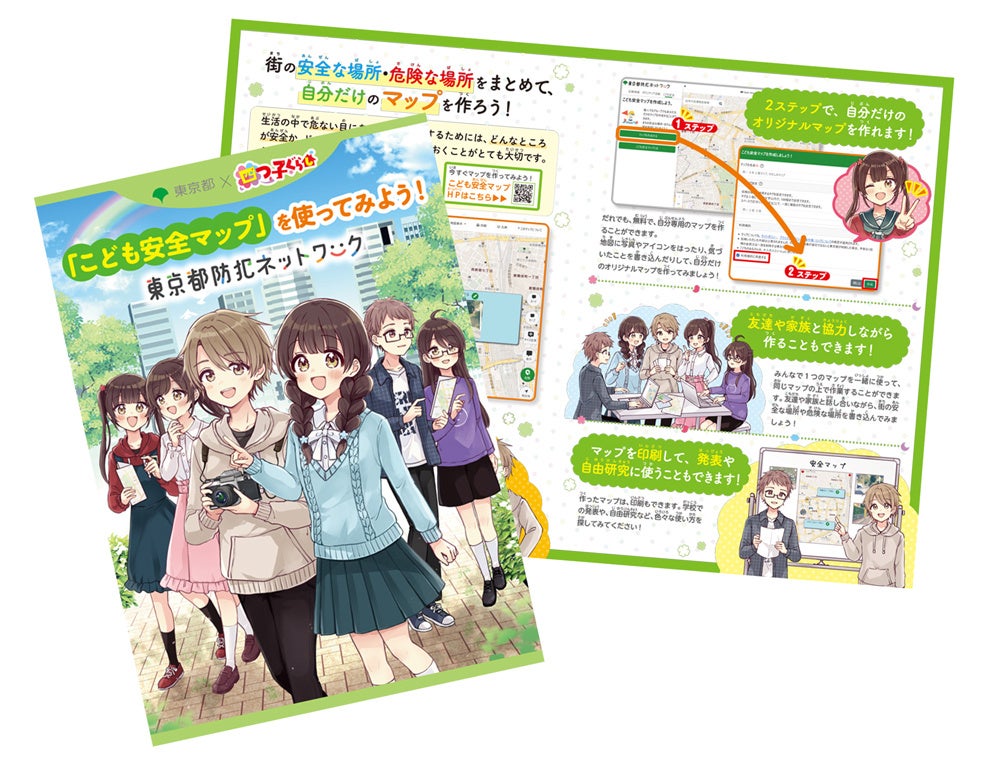 東京都の防犯活動支援ポータルサイト「東京都防犯ネットワーク」で提供されている「こども安全マップ」でも、「四つ子ぐらし」のコラボレーションを、2025年4月より実施中です。こども安全マップで使用できるキャラクターイラストのアイコン10種の配信は児童から大変好評で、マップの作り方を学べる、描き下ろしイラスト入りのリーフレットの配布も行っています。