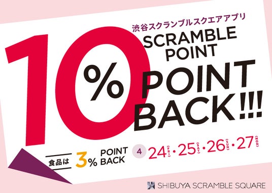 4月24日(金)~27日(月)まで、渋谷スクランブルスクエアアプリでのお支払いでスクランブルポイントがお得に貯まるキャンペーンを開催します。【対象期間】4月24日(金)~4月27日(月)