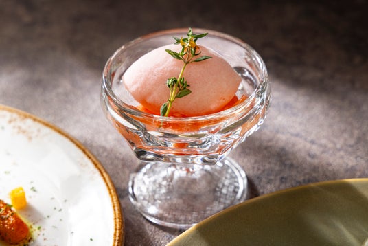 瑞々しいルビーライチの繊細な甘みを引き立てたわらび餅とソルベ。