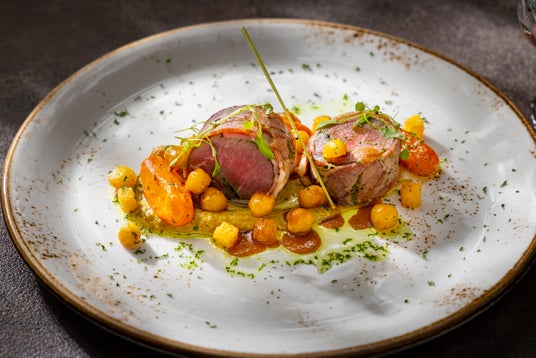 レモングラスと香草で香り高く仕上げた仔羊のロースト。なめらかな焼き茄子のピューレに、岐阜県「近縁屋(このえんや)」のスパイス七味唐辛子を重ね、繊細な辛味と香りの奥行きを添えました。