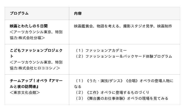 今年度も全6プログラムを実施する予定です。その中から、是枝裕和監督監修による映画、コシノヒロコ氏監修のファッション、東京文化会館が立川と狛江で実施するオペラの3つのプログラムの参加者を今回募集します。子供たちの芸術文化への夢や個性に寄り添いながら豊かな才能の開花を後押しすることを目指します。