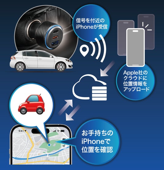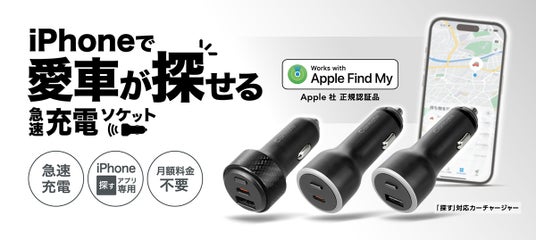 株式会社カーメイト(本社:東京都豊島区、代表取締役社長:徳田勝)は、スマートフォンの急速充電にApple社の「探す」機能を搭載した“「探す」対応 カーチャージャー”を、2026年2月~3月にかけて順次発売いたしました。本製品を車のシガーソケットに挿すだけで、手元のiPhone「探す」アプリから、車の位置が確認可能に。また、キャパシタを搭載しているため、エンジン停止後も約1週間「探す」機能が継続して作動します。対応ポートの違いにより3種類をラインアップしました。マイカーだけでなくカーシェアなどを利用する際も、スマートフォンへのスムーズな充電と駐車位置の確認をサポートします。各製品の発売日や詳細は以下をご覧ください。
