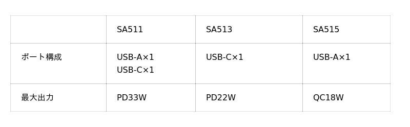 製品ごとに異なるポートを搭載しているため、お手持ちのiPhoneや充電したい機器に合わせて選ぶことができます。いずれも急速充電に対応しているため、日常使いの充電器としても便利です。