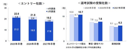 ○一人あたりのエントリー社数の平均は19.2社。前年同期調査(21.8社)より2.6社減少