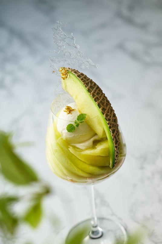 くし形に薄くカットしたアールスメロンをグラスに沿わせるようにデコレーションし、どの角度からもメロンの鮮やかな緑色が見える仕立てに。