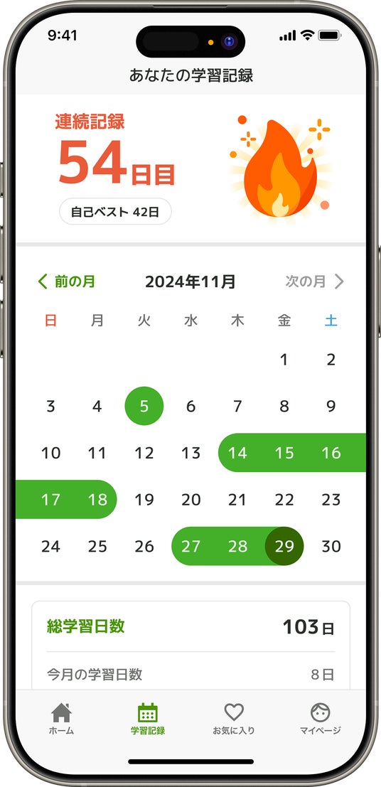 「あなたの学習記録」として、学習連続記録日数(自己ベスト日数)、総学習日数・学習時間が表示されます。 これまでの積み重ねが楽しいビジュアルで可視化され、モチベーション管理に役立ちます。