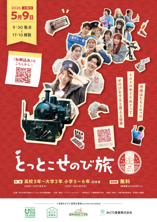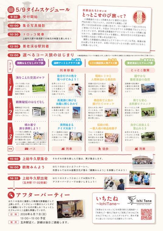 6年目となる2026年は、テーマを「とっとこせのび旅」とし、参加者自身が市原を歩きながら旅番組を制作する「みんなで作る旅番組プロジェクト」として開催します。参加者は番組のゲストとしてトロッコ列車に乗車し、沿線の豊かな自然や地元グルメを体験するとともに、地域住民との交流や新たな仲間との出会いを楽しむことができます。撮影した映像は後日提供され、人生の節目にふさわしい思い出として形に残すことが可能です。