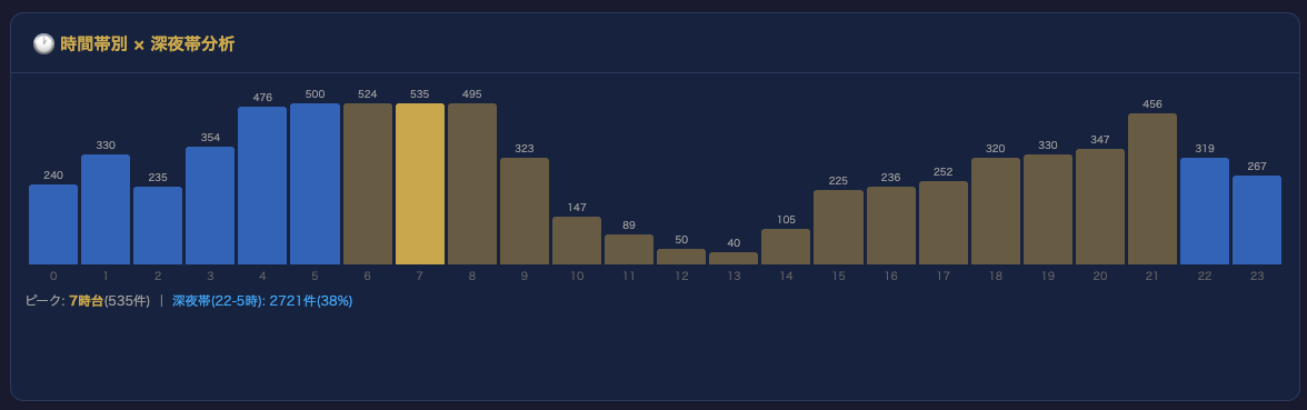 深夜帯には、仕事の疲弊に関する短文の表出や、「生きる意味」「自分の存在価値」といった実存的な問いの比率が高まる傾向がみられました。
