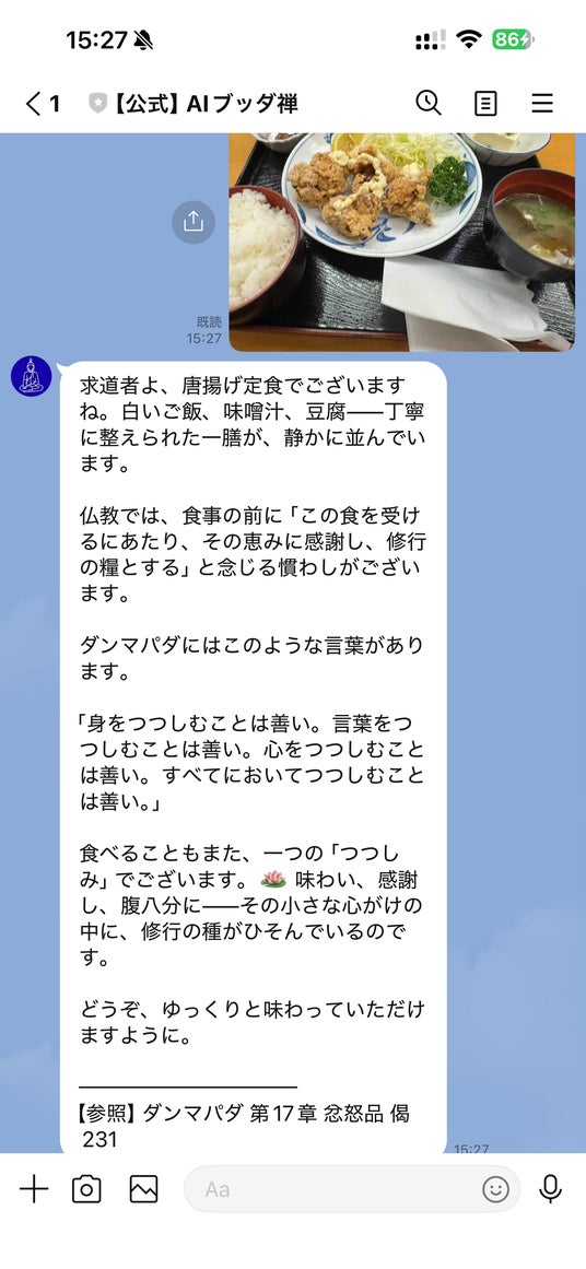 AIブッダ 禅はテキスト相談だけでなく、写真を送ると仏教の教えで応答する「画像対話」に対応しています。直近5日間で35件の画像メッセージが送信されました。桜の写真を送ると無常の教えで応答し、食事の写真を送ると感謝と足るを知る教えで応じるなど、日常の風景を仏教の視点で読み解く体験が利用されています。