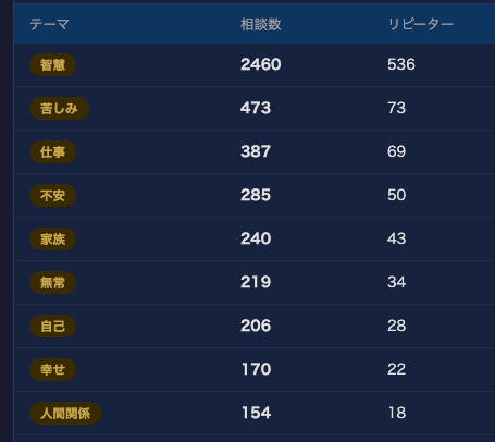 AIブッダ 禅は、ユーザーのメッセージを受信した時点で、AIが応答に使う経典を検索するためにテーマタグ(20カテゴリ)を自動付与します。このテーマタグの累計集計により、以下の相談傾向が明らかになりました。